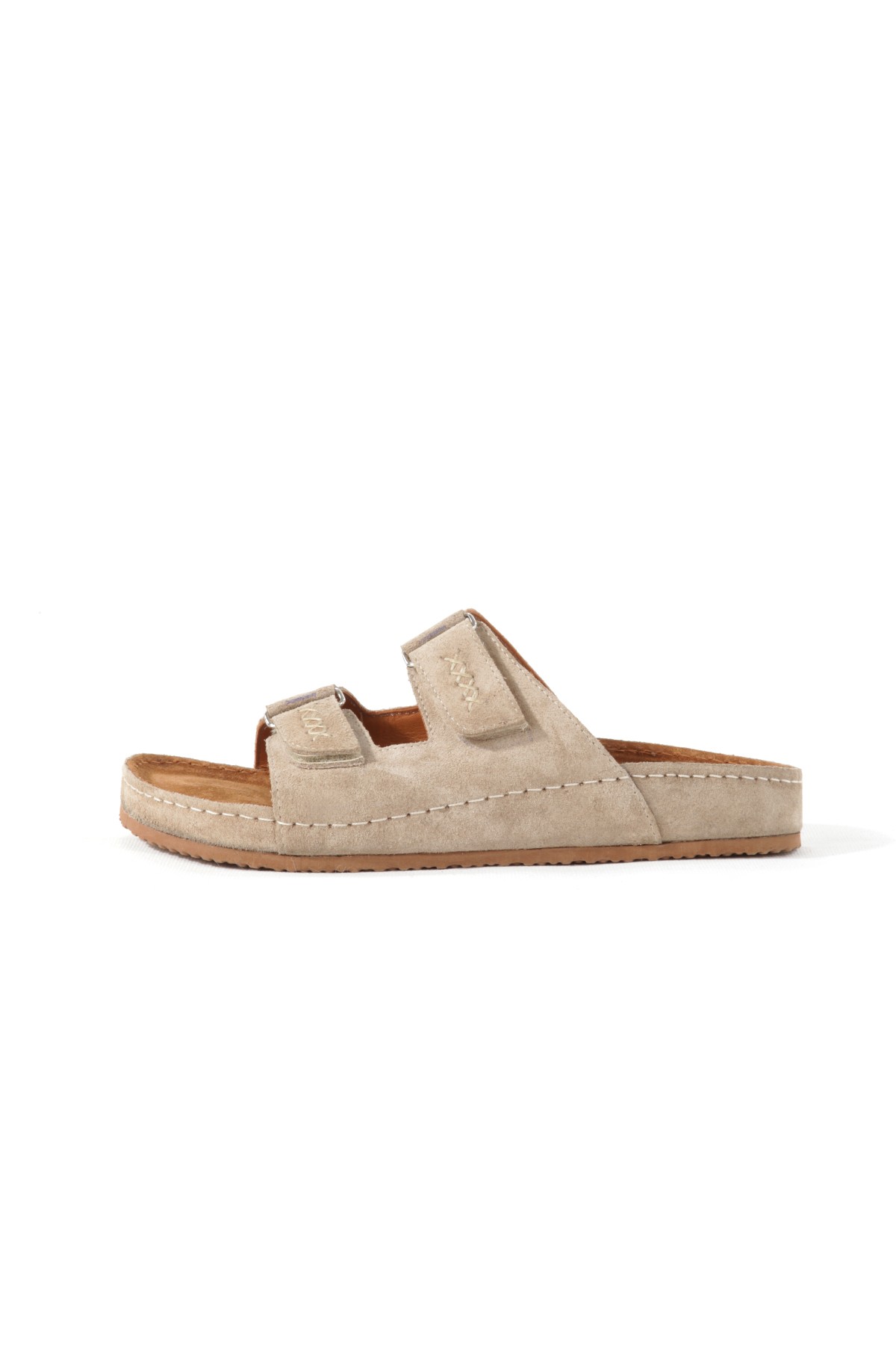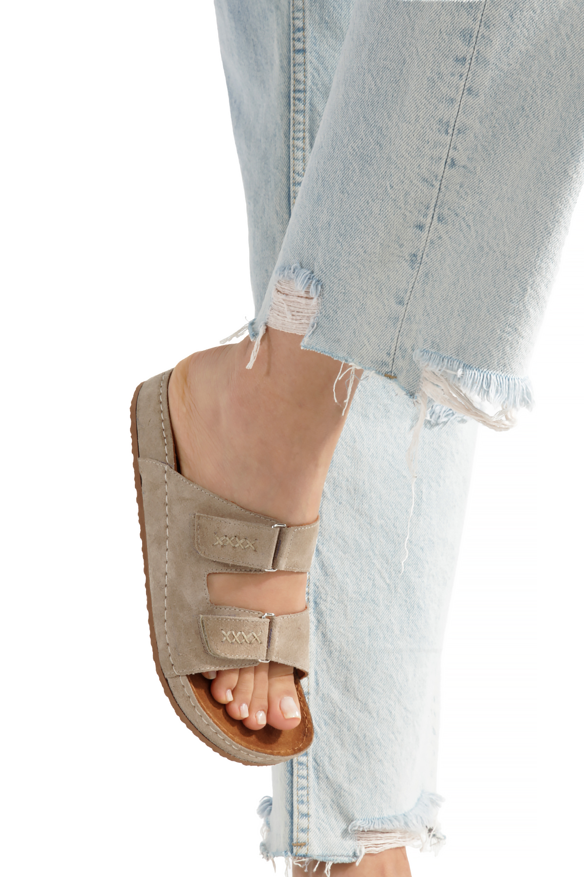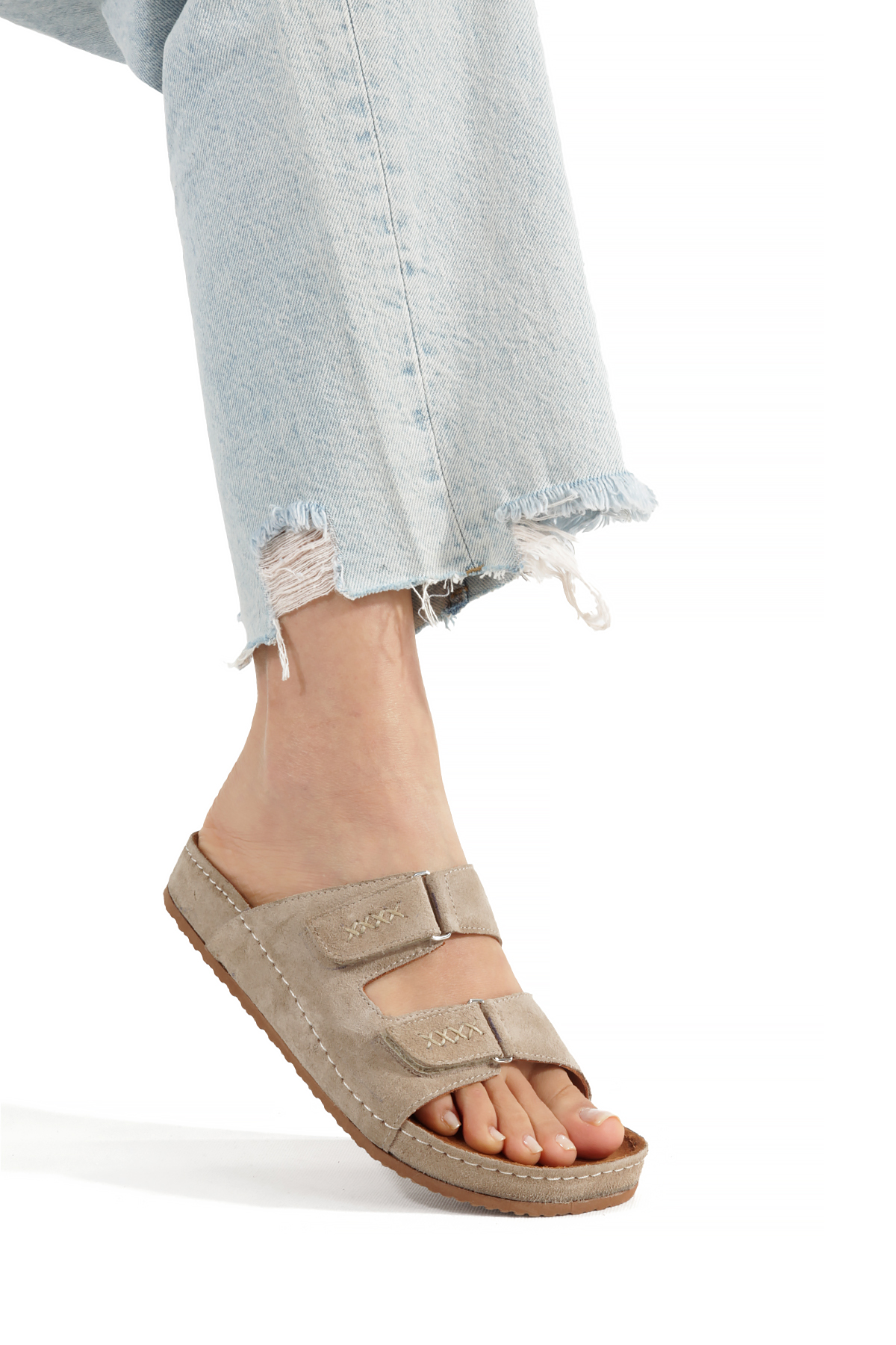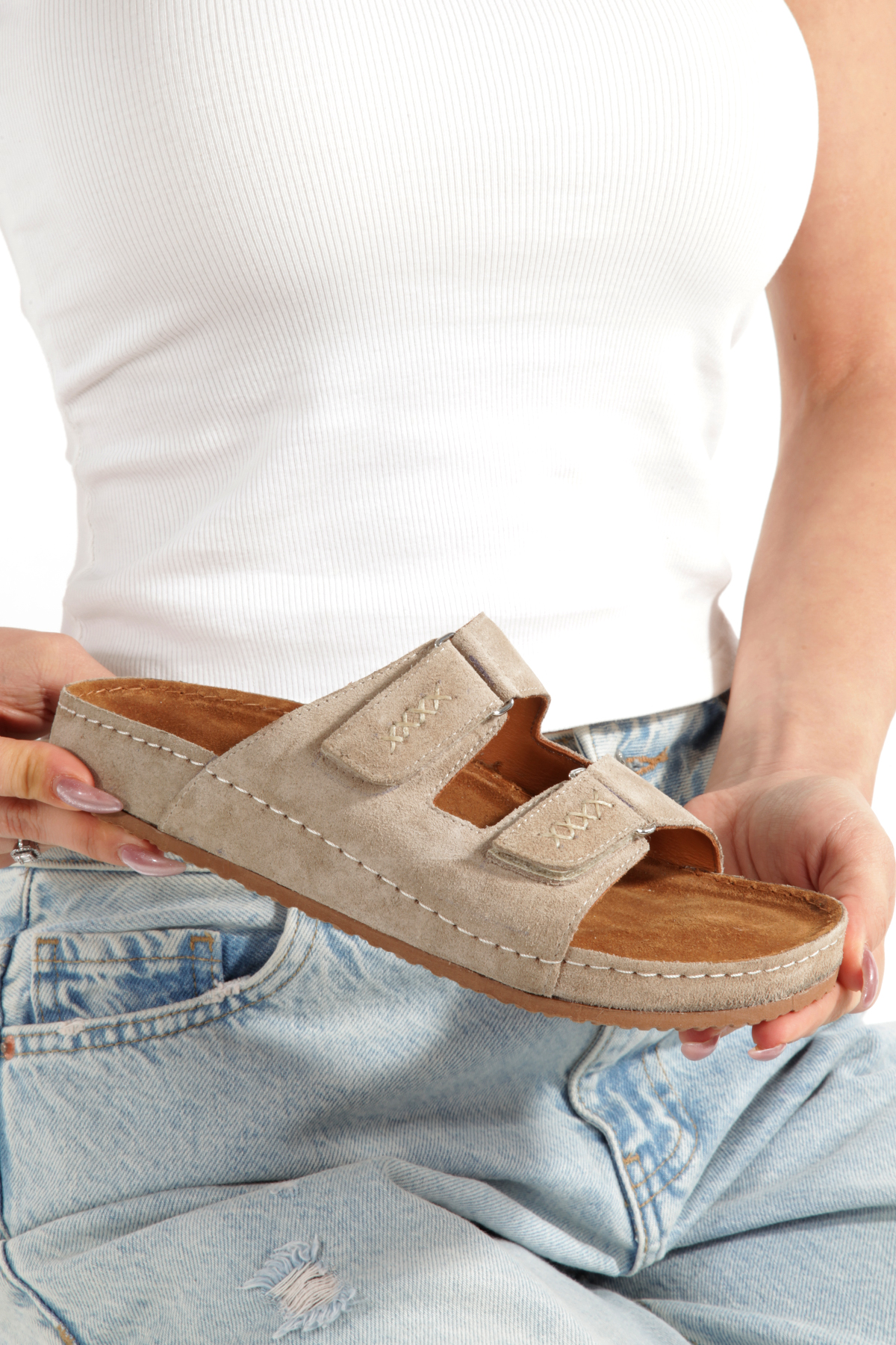 Zamansız bej rengi ve çift bantlı tasarımıyla öne çıkan bu kadın terlik, hem konfor hem de şıklığı bir arada sunar. Süet kaplı yüzeyi ayağınıza yumuşak bir his verirken, ayarlanabilir bantları sayesinde kişiye özel uyum sağlar. Günlük kombinlerle kolayca eşleşen sade tasarımı, şehir hayatında pratik ve stil sahibi bir kullanım sunar.