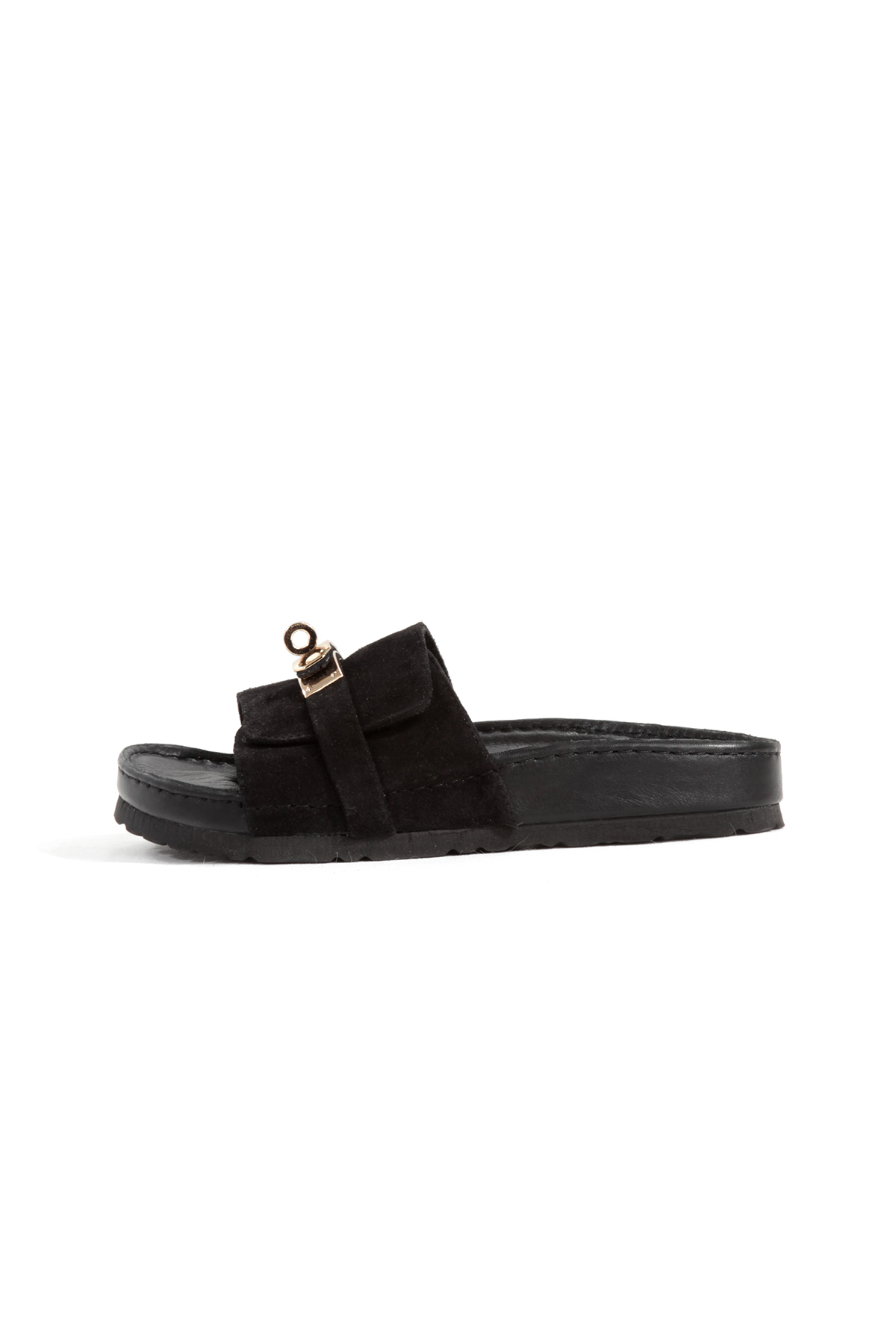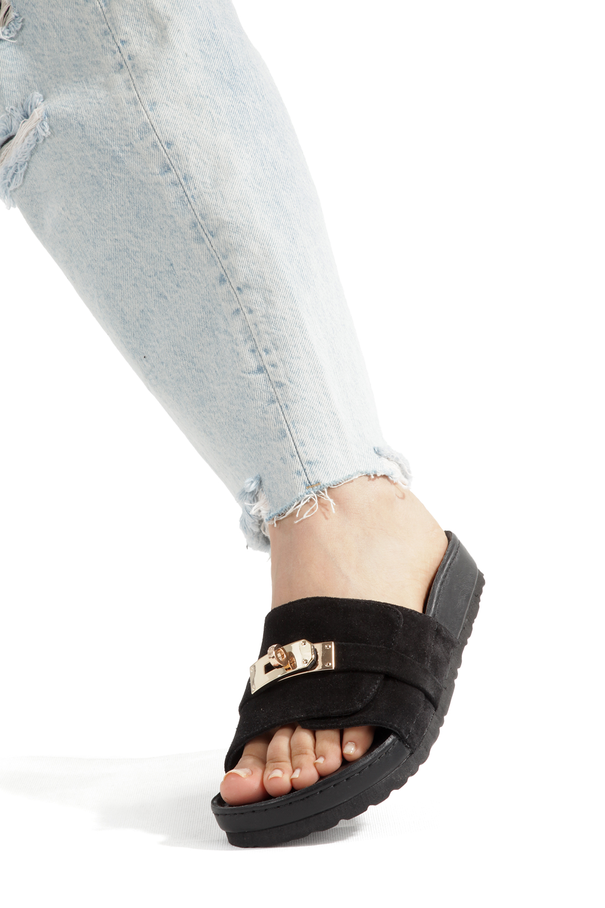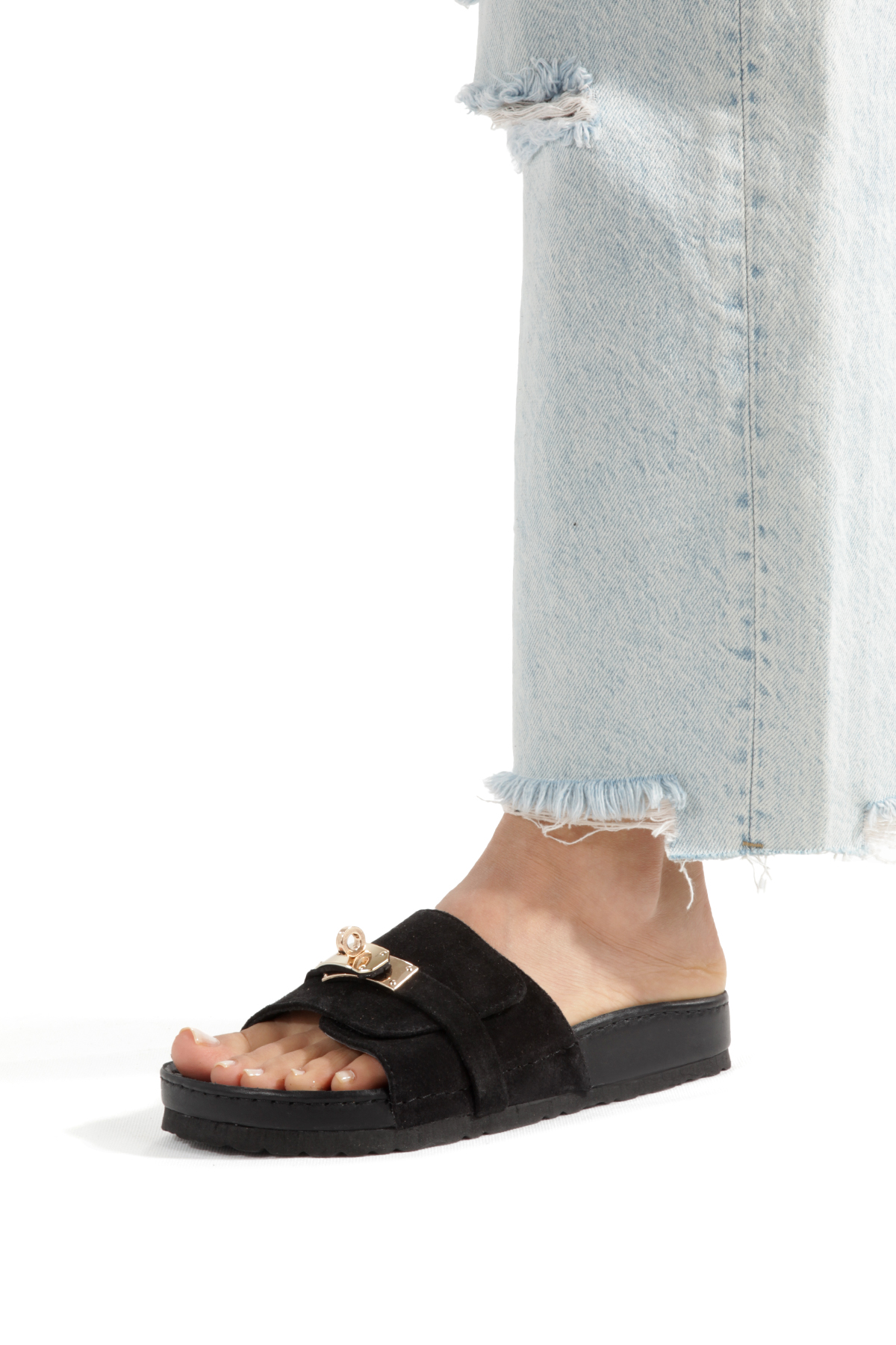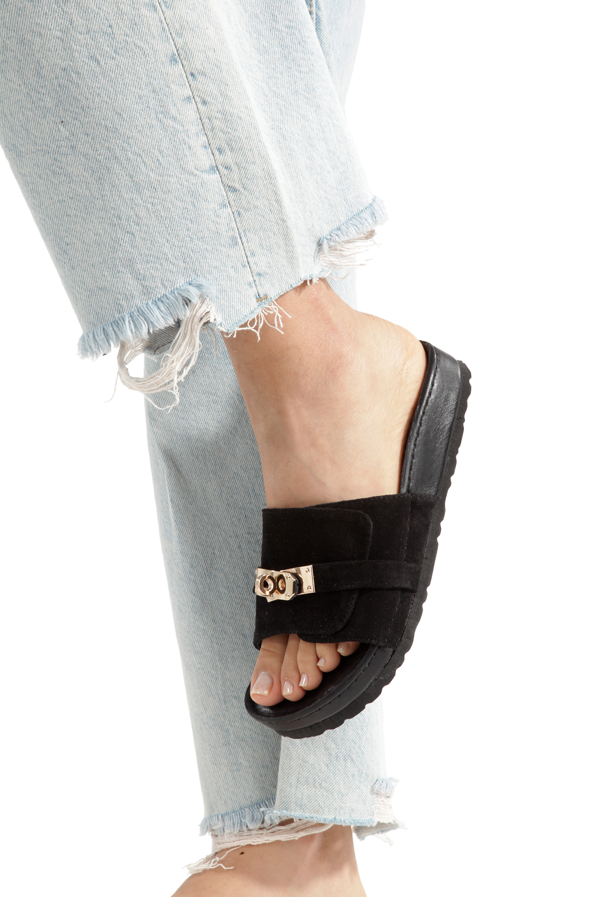 Metal Aksesuarlı Süet Siyah Kadın Terlik