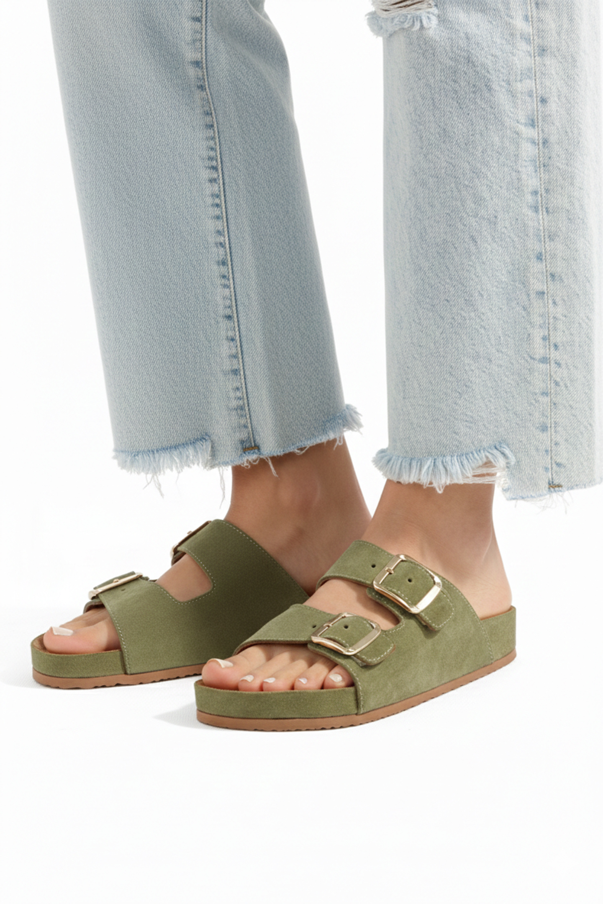 Doğal tonlardan ilham alan petrol yeşili süet yüzeyi ve ergonomik taban yapısıyla tasarlanan bu çift tokalı kadın terlik, günlük stilinizi zahmetsiz bir şıklıkla tamamlar. Yumuşak iç tabanı sayesinde gün boyu konfor sağlarken, ayarlanabilir metal tokaları ile ayağınıza mükemmel uyum sunar. Modern ve sade tasarımı sayesinde hem ev içinde hem dış mekânda stil sahibi bir kullanım deneyimi sunar.