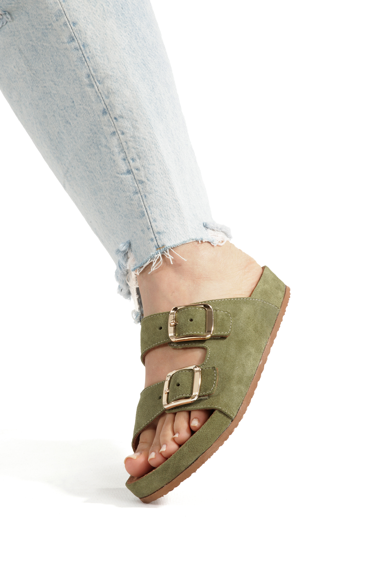 Petrol Yeşili Süet Çift Tokalı Kadın Terlik